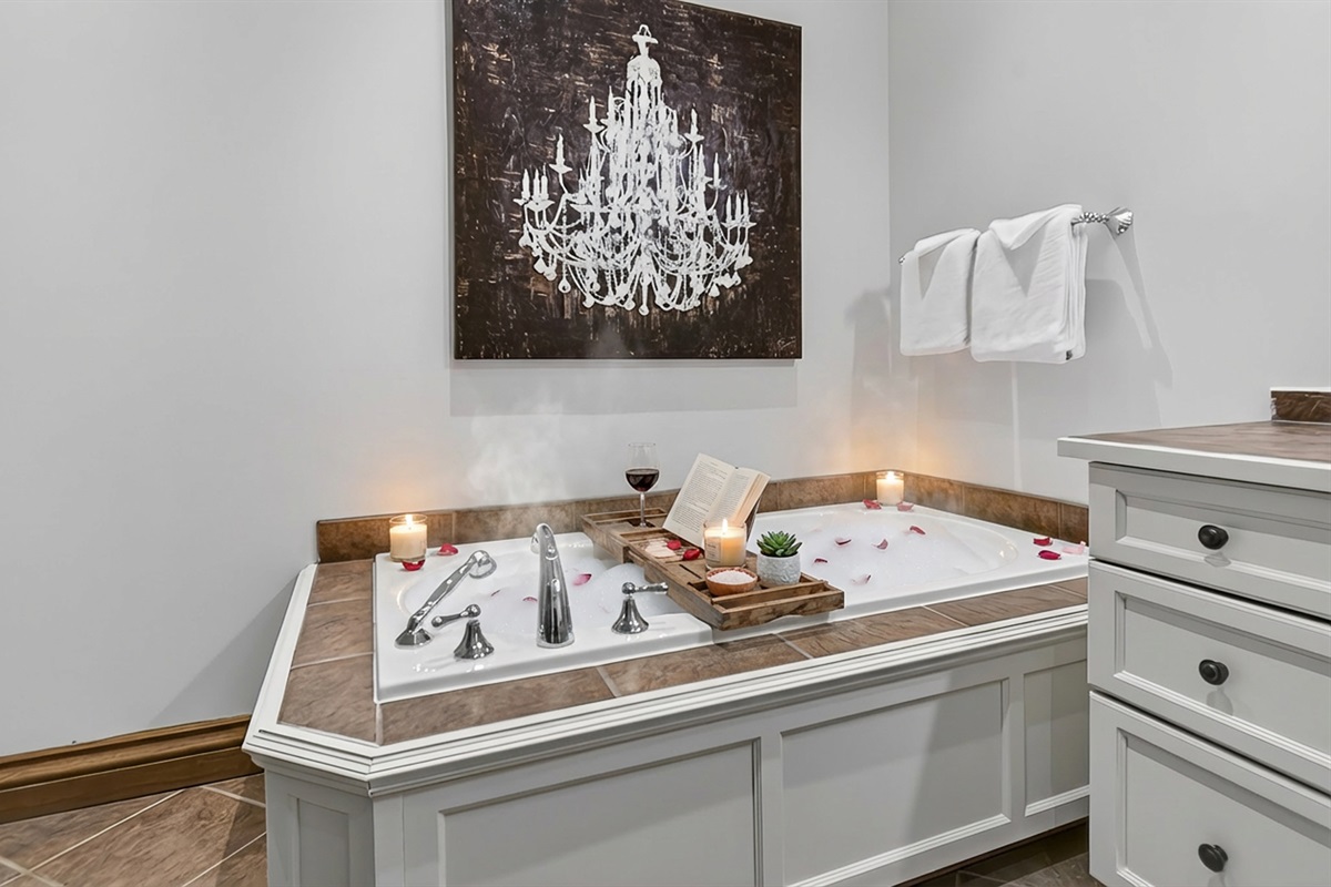 ✹ Bathroom 1 (upper level): En suite to primary bedroom for complete privacy, single vanity, walk-in shower, separate jacuzzi tub